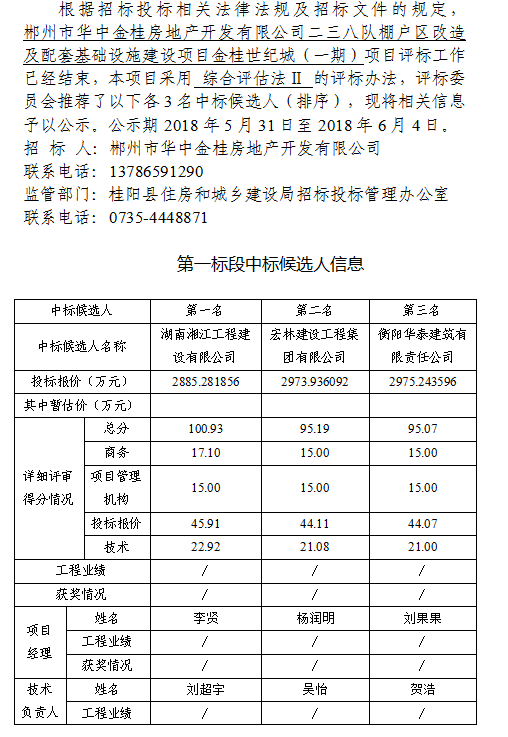 郴州市華中金桂房地產(chǎn)開(kāi)發(fā)有限公司二三八隊(duì)棚戶區(qū)改造及配套基礎(chǔ)設(shè)施建設(shè)項(xiàng)目金桂世紀(jì)城(一期)中標(biāo)候選人公示表