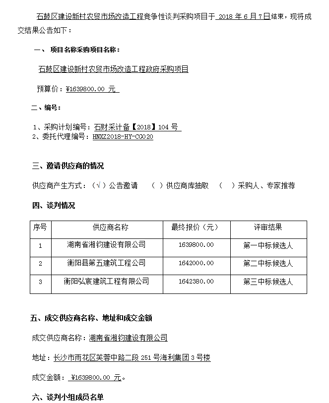 石鼓區(qū)建設(shè)新村農(nóng)貿(mào)市場(chǎng)改造工程政府采購(gòu)項(xiàng)目 競(jìng)爭(zhēng)性談判成交結(jié)果公告