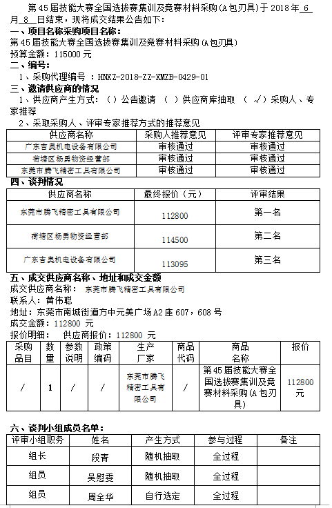 第45屆技能大賽全國選拔賽集訓及競賽材料采購 (A包刃具) 競爭性談判成交公告