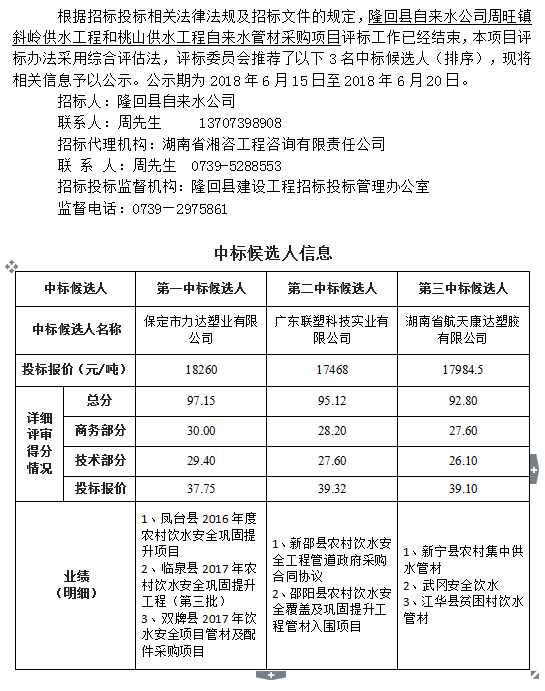 隆回縣自來水公司周旺鎮(zhèn)斜嶺供水工程和桃山供水工程自來水管材采購項目招標投標信息公示表