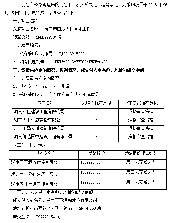 沅江市公路管理局的沅江市白沙大橋亮化工程競(jìng)爭(zhēng)性談判成交結(jié)果公告