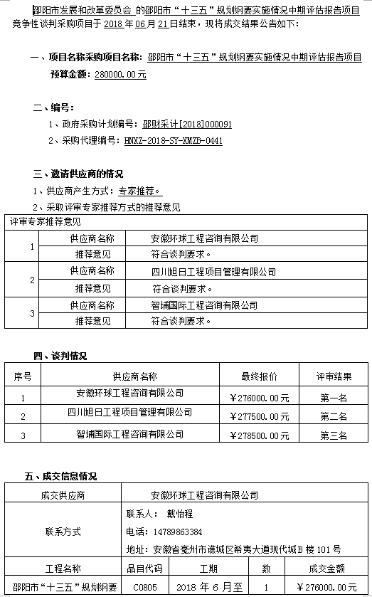 邵陽市“十三五”規(guī)劃綱要實施情況中期評估報告項目談判成交公告