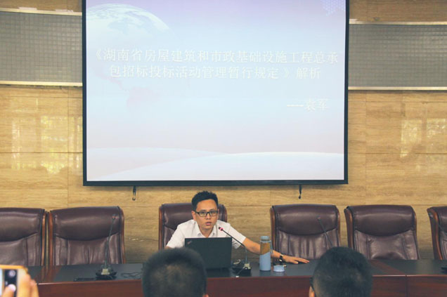 湘咨訊(陳劍光) 7 月 21 日,我公司在二樓組織召開了《湖南省房:建筑和市政基礎設施工程總承包招標投標活動管理暫行規(guī)定》湘建監(jiān)督【2017】76號文專題學習會(以下簡稱《暫行規(guī)定》)。會議原文學習了《暫行規(guī)定》,副總經(jīng)理袁軍主要從 27 條規(guī)定來講授,每條規(guī)定進行了詳盡的解析。