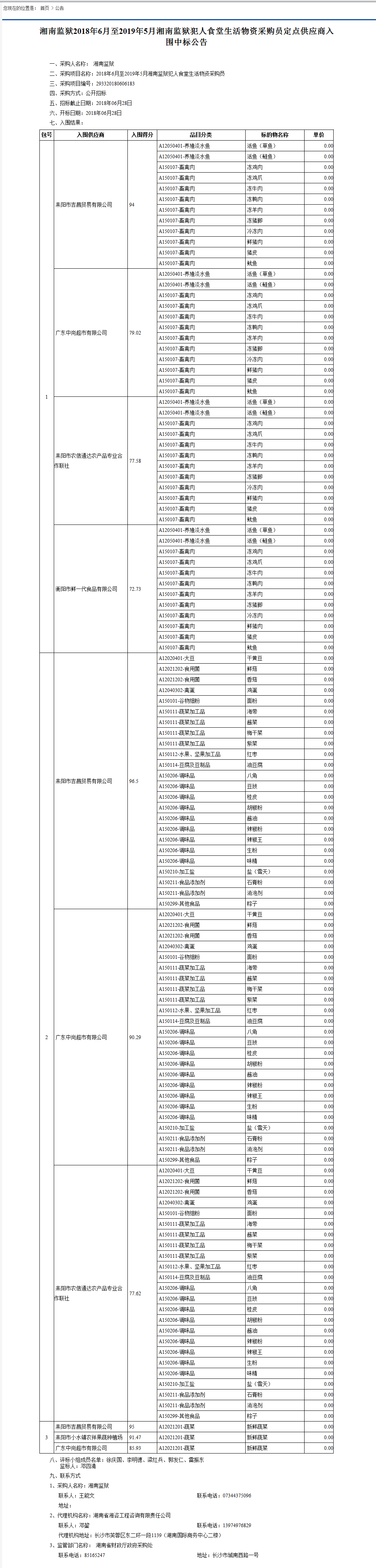 湘南監(jiān)獄2018年6月至2019年5月湘南監(jiān)獄犯人食堂生活物資采購(gòu)員定點(diǎn)供應(yīng)商入圍中標(biāo)公告
