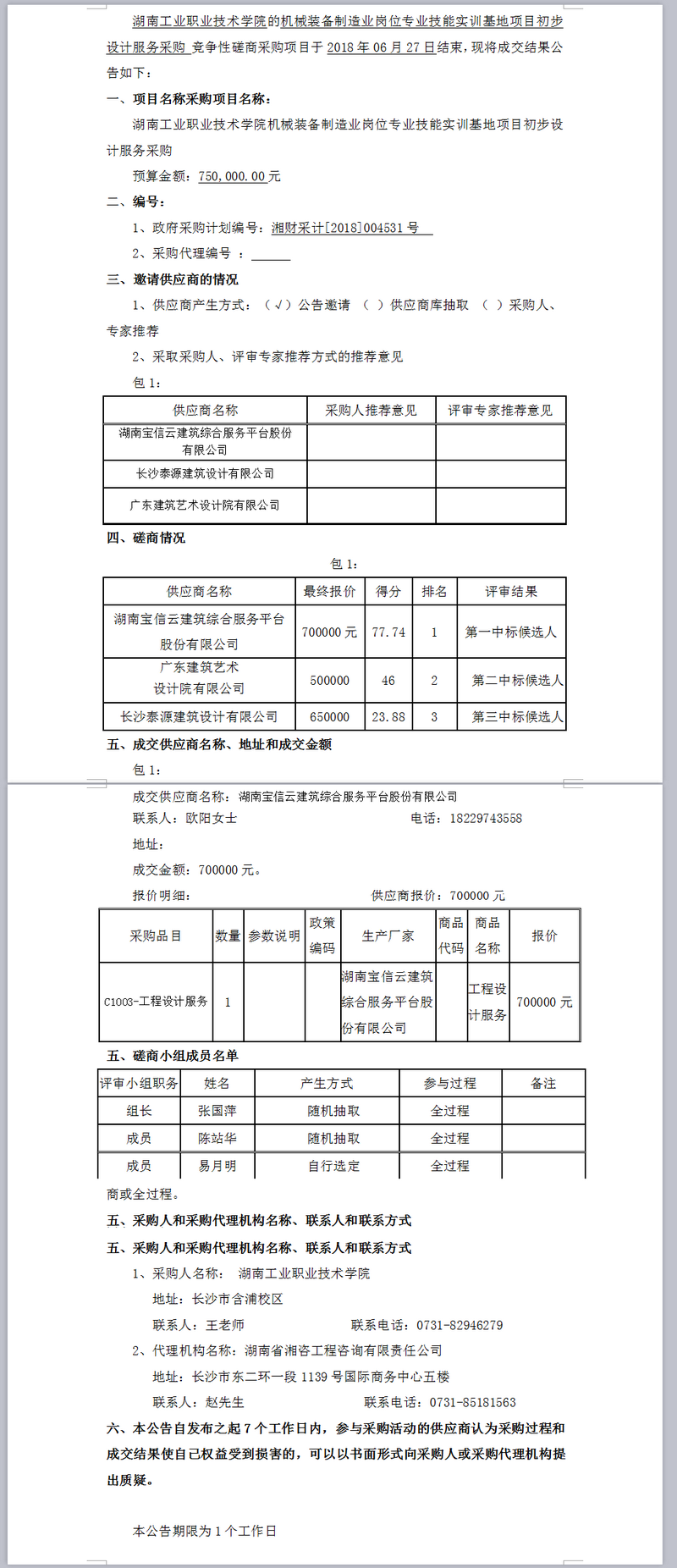 湖南工業(yè)職業(yè)技術(shù)學(xué)院機(jī)械裝備制造業(yè)崗位專業(yè)技能實(shí)訓(xùn)基地項(xiàng)目初步設(shè)計(jì)服務(wù)采購(gòu)競(jìng)爭(zhēng)性磋商成交公告