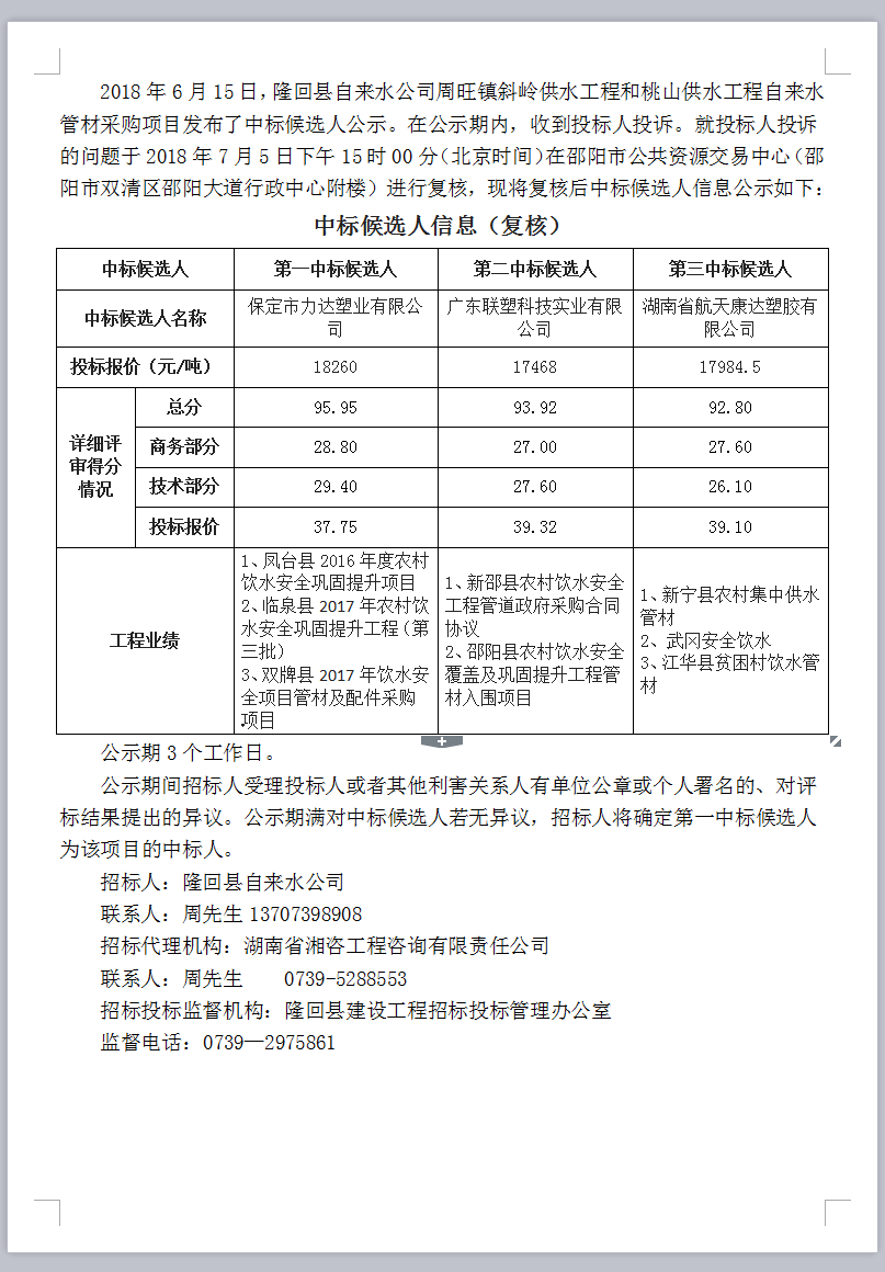 隆回縣自來水公司周旺鎮(zhèn)斜嶺供水工程和桃山供水工程自來水管材采購項(xiàng)目招標(biāo)投標(biāo)信息公示表(復(fù)核)