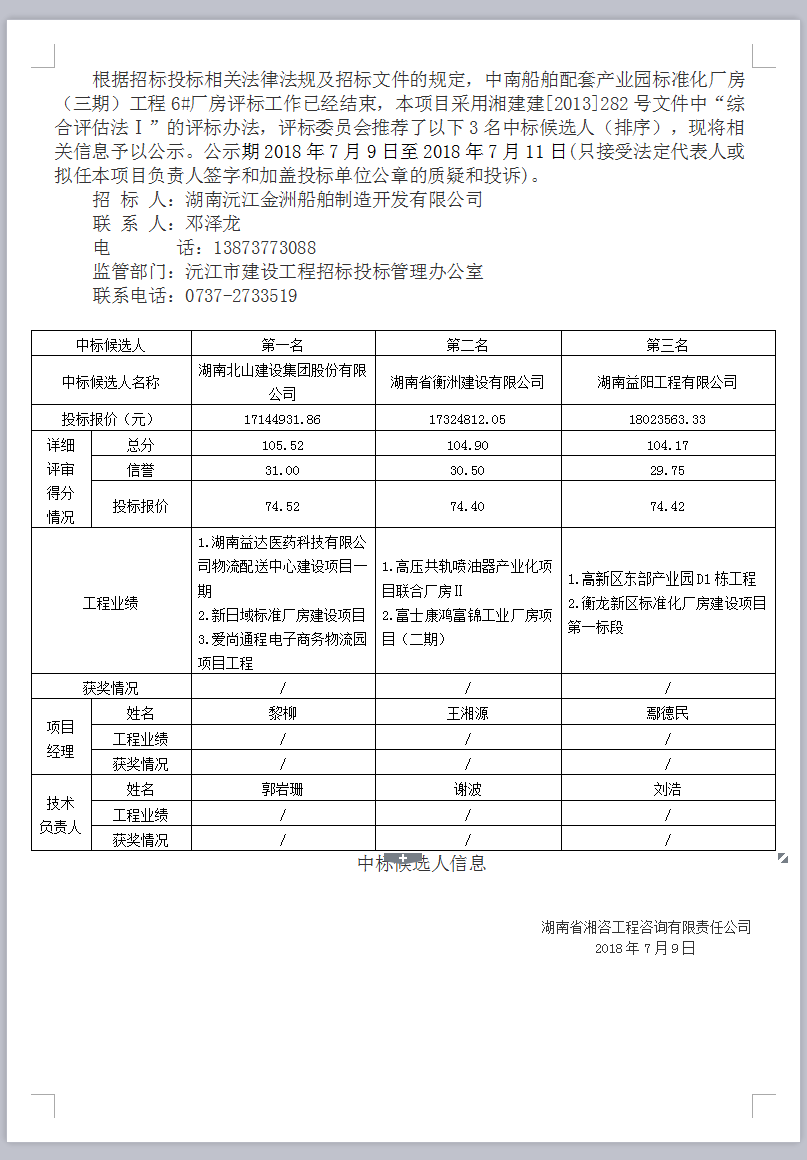 中南船舶配套產(chǎn)業(yè)園標(biāo)準(zhǔn)化廠房(三期)工程6#廠房中標(biāo)候選人公示