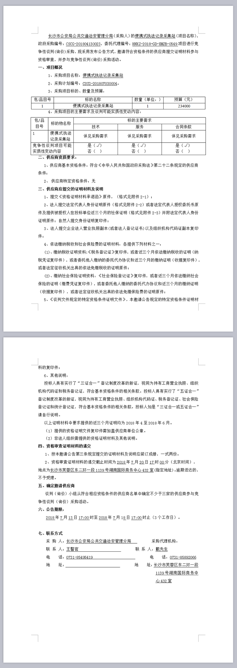 長(zhǎng)沙市公安局公共交通治安管理分局便攜式執(zhí)法記錄采集站競(jìng)爭(zhēng)性談判邀請(qǐng)公告
