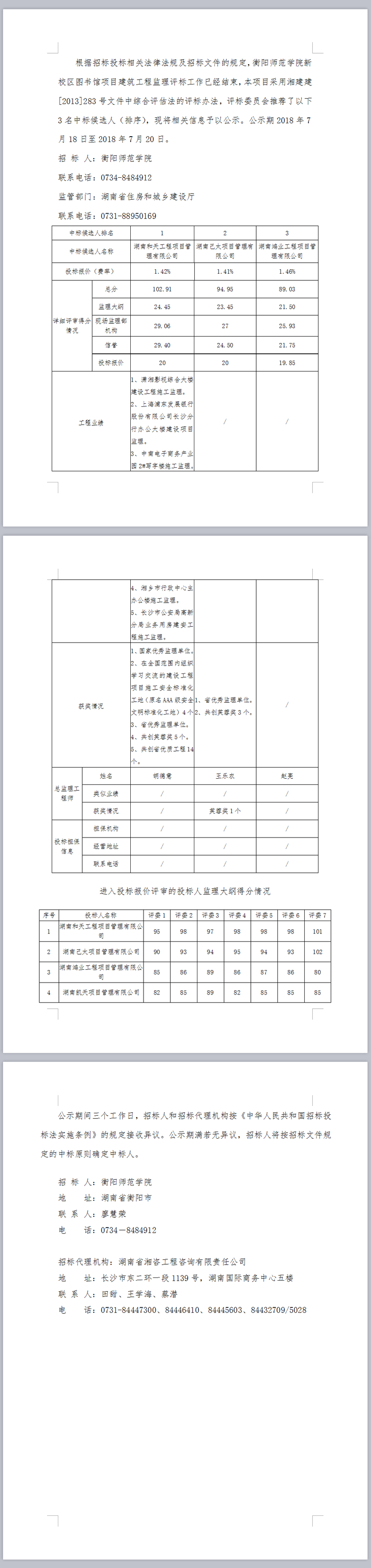 衡陽師范學(xué)院新校區(qū)圖書館項(xiàng)目建筑工程監(jiān)理招標(biāo)投標(biāo)信息公示表