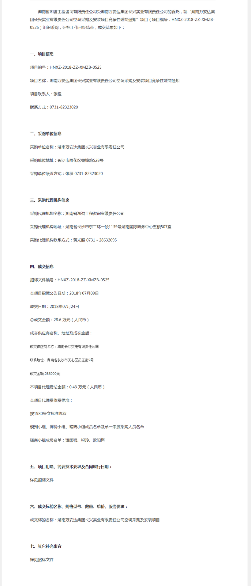 湖南萬安達(dá)集團(tuán)長興實業(yè)有限責(zé)任公司空調(diào)采購及安裝項目競爭性磋商通知成交公告