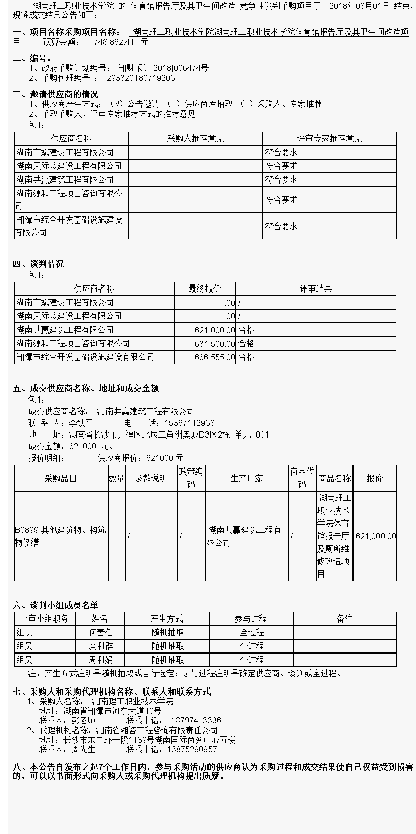 湖南理工職業(yè)技術(shù)學(xué)院湖南理工職業(yè)技術(shù)學(xué)院體育館報(bào)告廳及其衛(wèi)生間改造項(xiàng)目競(jìng)爭(zhēng)性談判成交公告