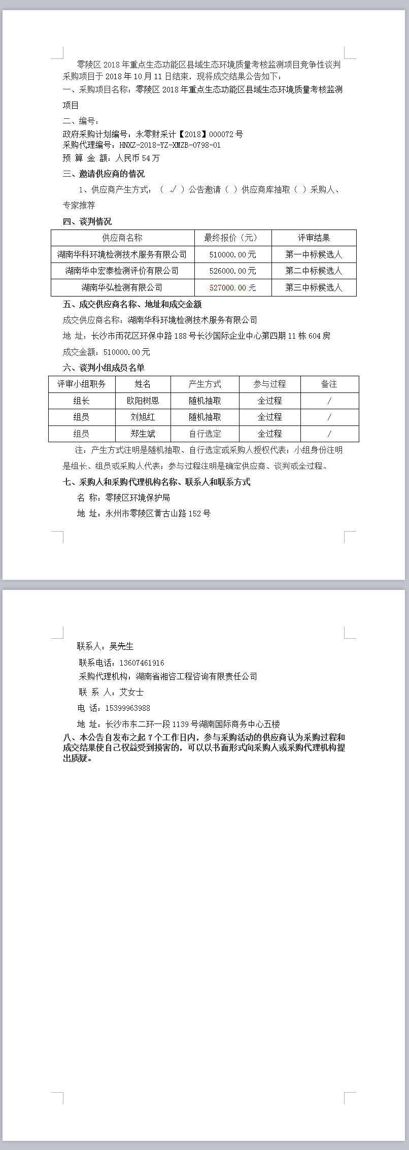 零陵區(qū)2018年重點(diǎn)生態(tài)功能區(qū)縣域生態(tài)環(huán)境質(zhì)量考核監(jiān)測項(xiàng)目 競爭性談判成交公告