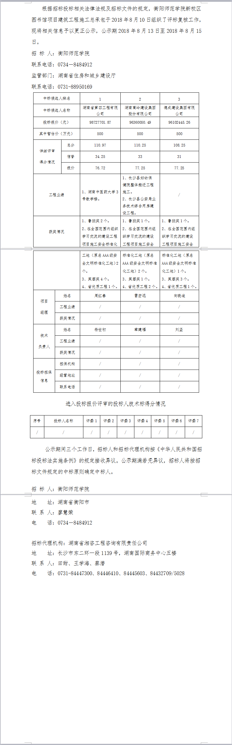 衡陽師范學(xué)院新校區(qū)圖書館項目建筑工程施工總承包招標(biāo)投標(biāo)信息公示表更正公示