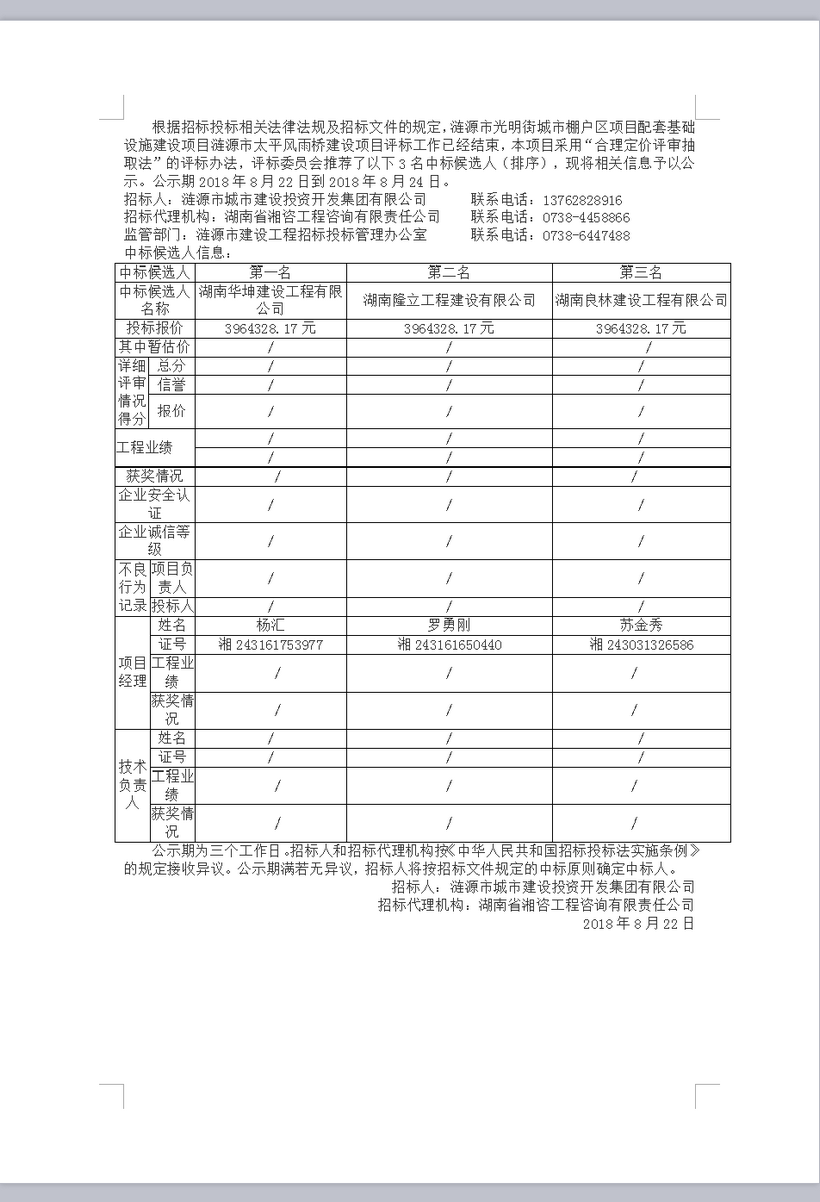 漣源市光明街城市棚戶區(qū)項(xiàng)目配套基礎(chǔ)設(shè)施建設(shè)項(xiàng)目漣源市太平風(fēng)雨橋建設(shè)項(xiàng)目中標(biāo)候選人公示