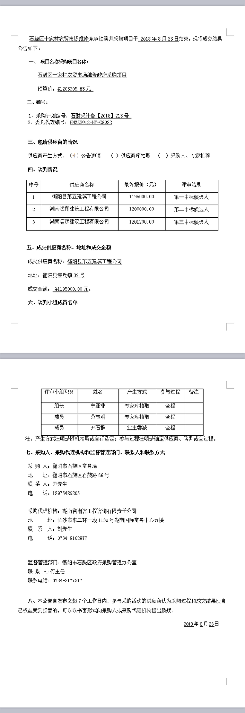 石鼓區(qū)十家村農貿市場維修政府采購項目 競爭性談判成交結果公告