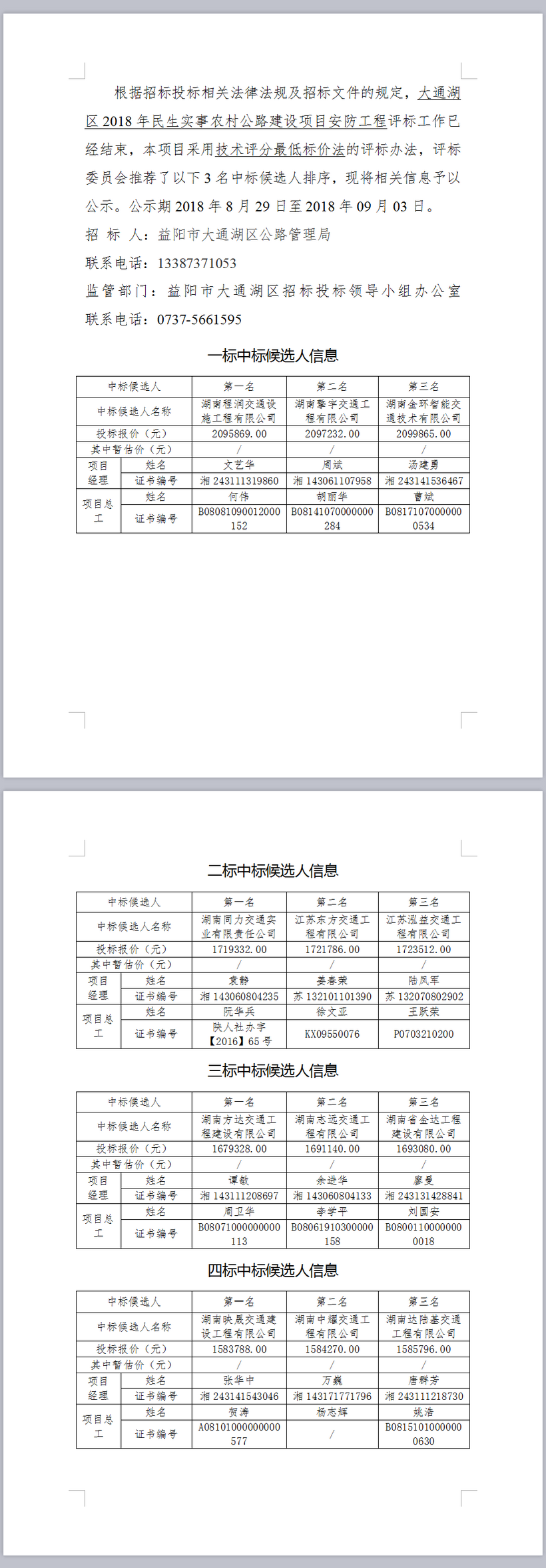 大通湖區(qū)2018年民生實(shí)事農(nóng)村公路建設(shè)項(xiàng)目安防工程中標(biāo)候選人公示