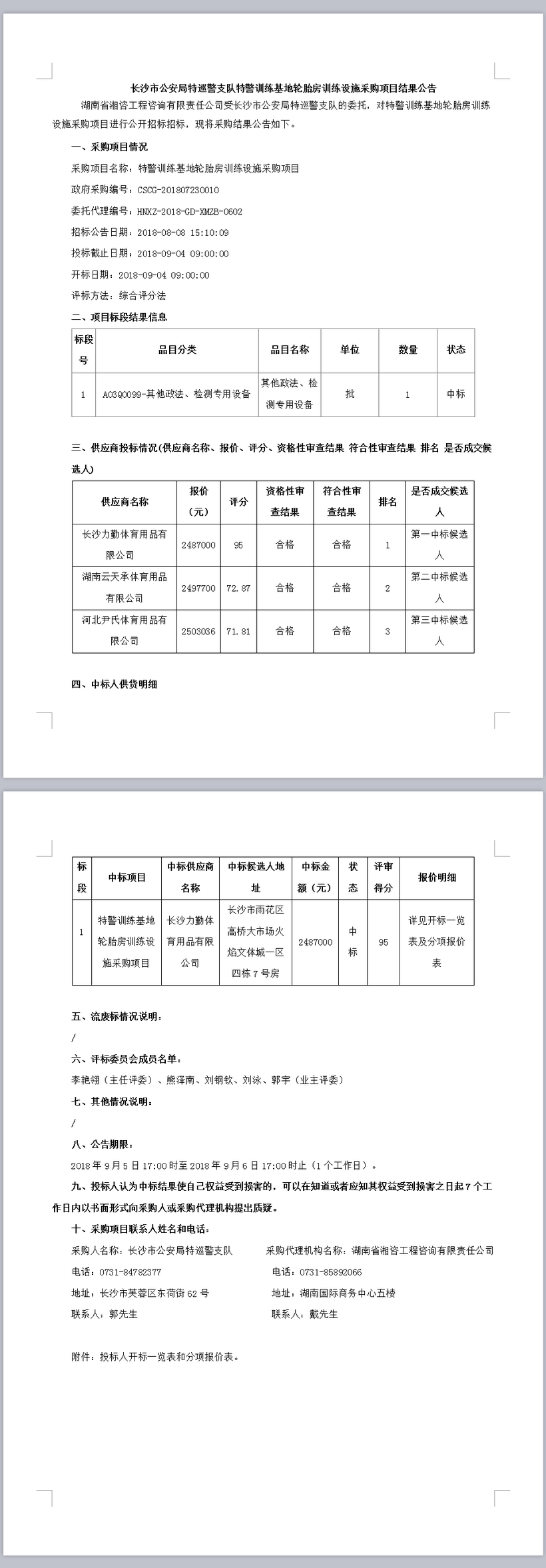 長沙市公安局特巡警支隊特警訓(xùn)練基地輪胎房訓(xùn)練設(shè)施采購項目結(jié)果公告