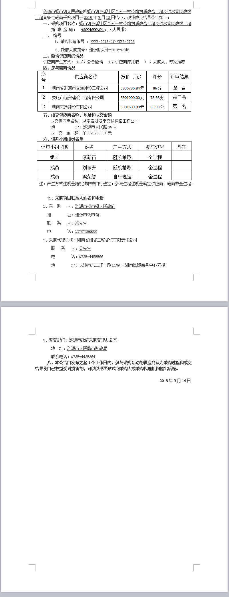 楊市鎮(zhèn)泉溪社區(qū)至五一村公路提質(zhì)改造工程及供水管網(wǎng)改線工程競(jìng)爭(zhēng)性磋商成交結(jié)果公告