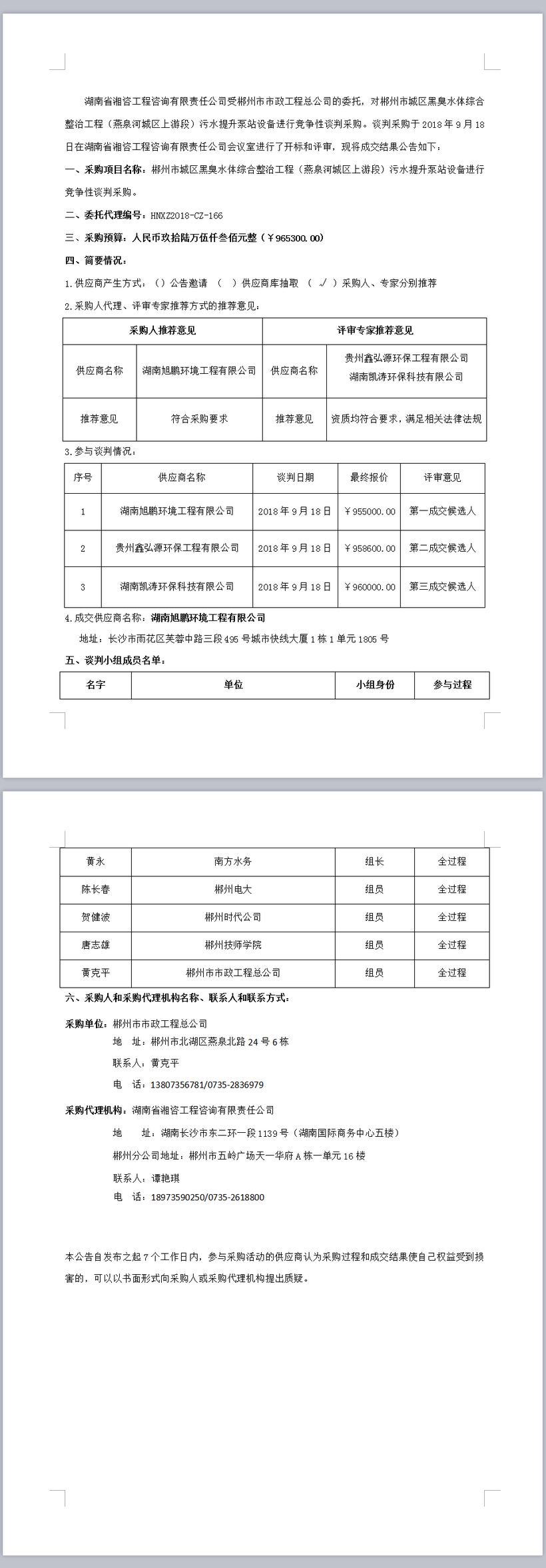 郴州市城區(qū)黑臭水體綜合整治工程(燕泉河城區(qū)上游段)污水提升泵站設(shè)備競爭性談判采購成交公告