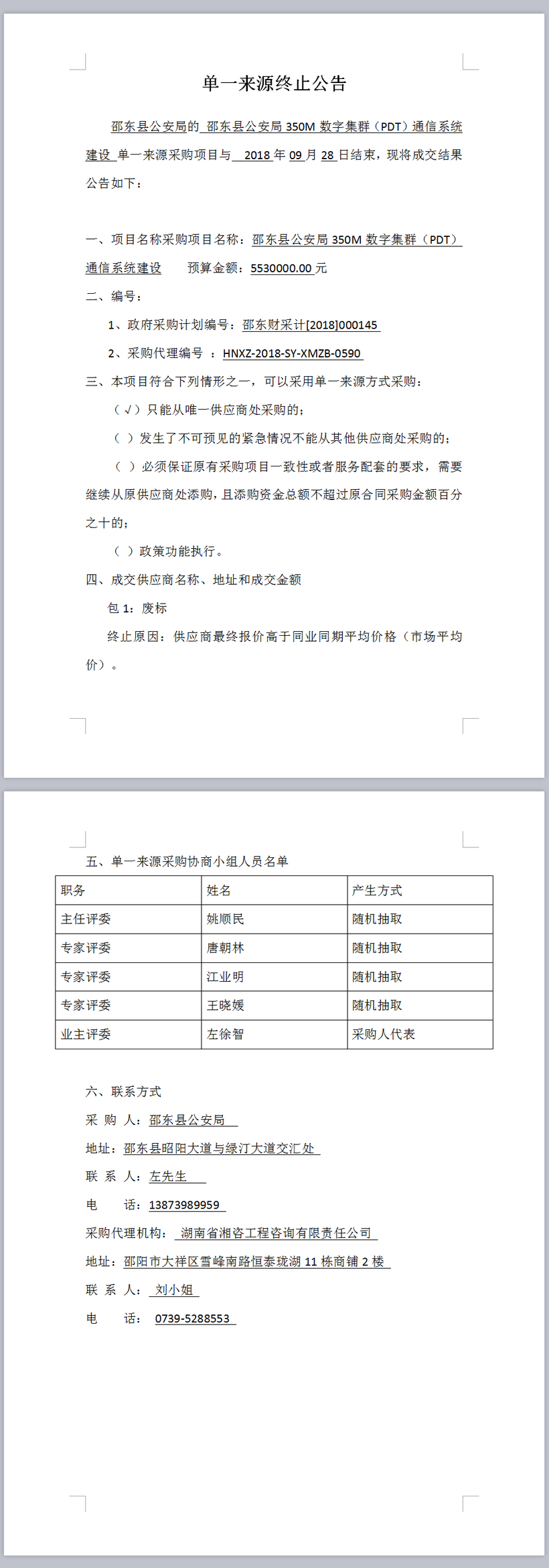 邵東縣公安局350M數(shù)字集群(PDT)通信系統(tǒng)建設(shè)單一來源終止公告