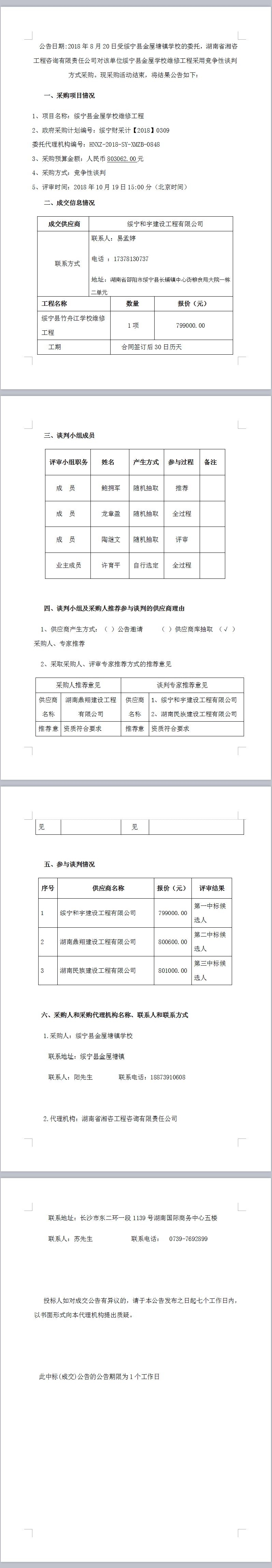 綏寧縣金屋學(xué)校維修工程談判成交公告