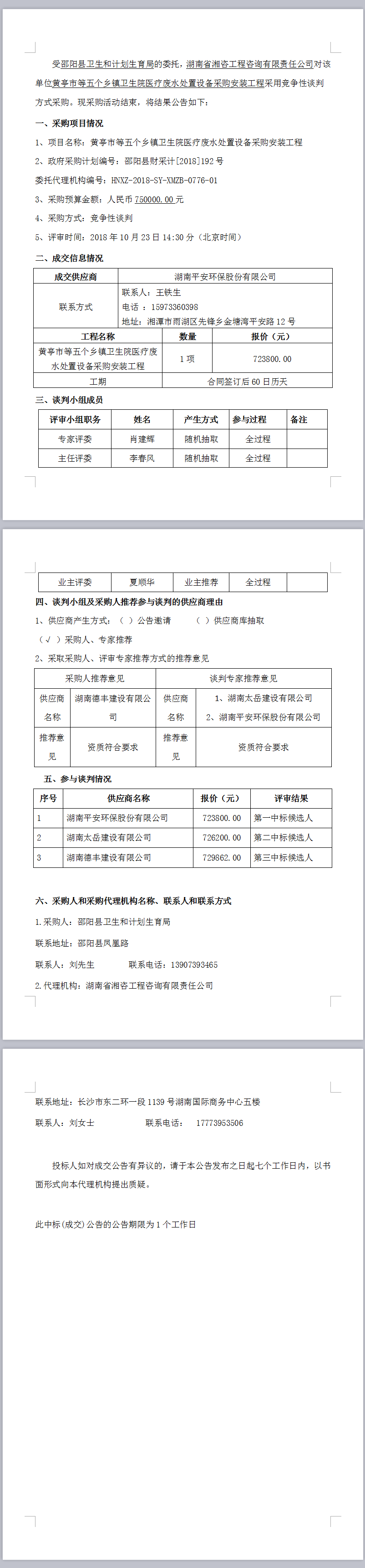 黃亭市等五個(gè)鄉(xiāng)鎮(zhèn)衛(wèi)生院醫(yī)療廢水處置設(shè)備采購安裝工程談判成交公告