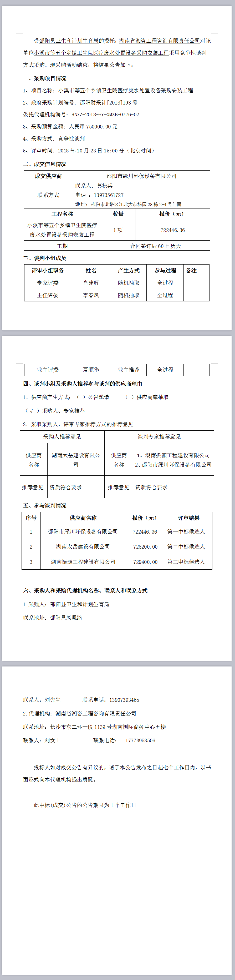 小溪市等五個鄉(xiāng)鎮(zhèn)衛(wèi)生院醫(yī)療廢水處置設(shè)備采購安裝工程談判成交公告