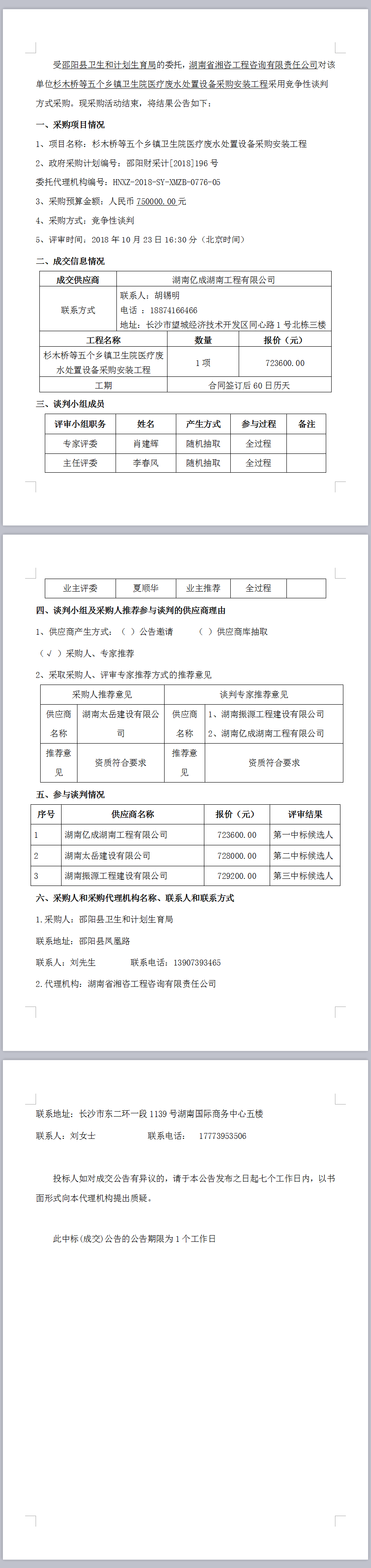 杉木橋等五個(gè)鄉(xiāng)鎮(zhèn)衛(wèi)生院醫(yī)療廢水處置設(shè)備采購安裝工程談判成交公告