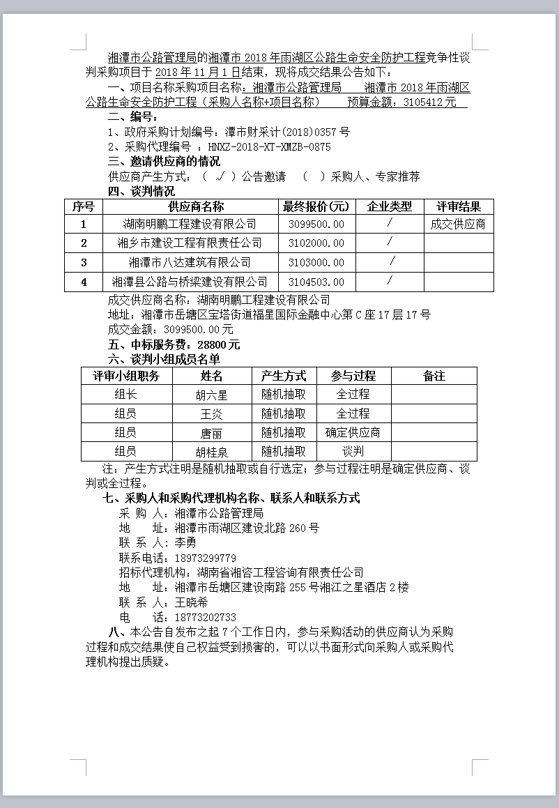湘潭市2018年雨湖區(qū)公路生命安全防護(hù)工程競爭性談判成交結(jié)果公告