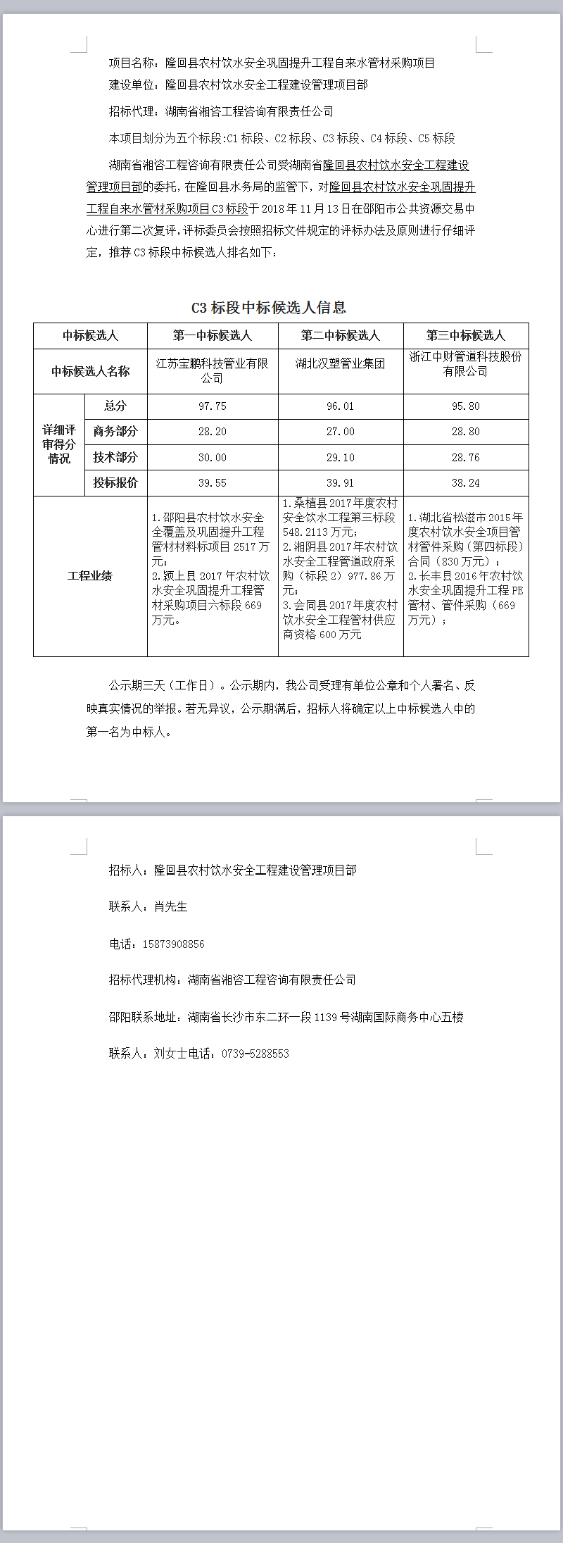 隆回縣農(nóng)村飲水安全鞏固提升工程自來水管材采購項目C3標段招標投標信息公示表 (第二次復評)