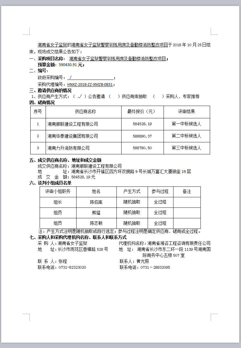 湖南省女子監(jiān)獄警察訓練用房及備勤樓消防整改項目成交結果公告