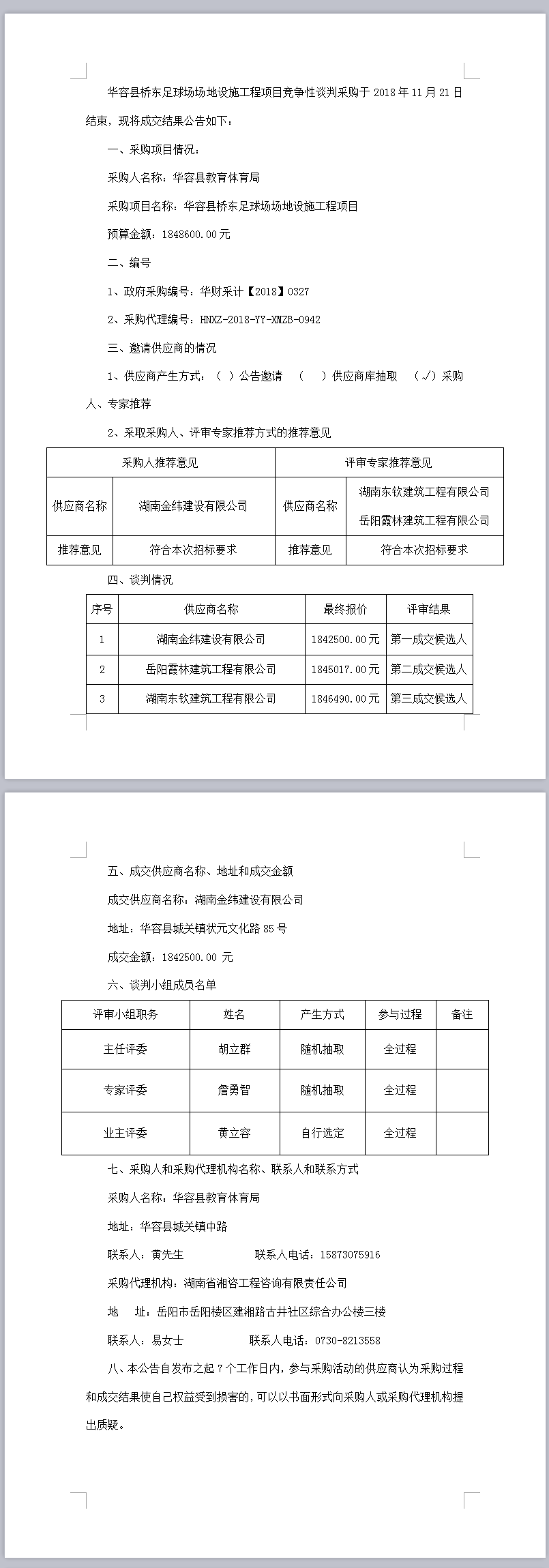 華容縣橋東足球場場地設(shè)施工程項(xiàng)目 競爭性談判成交結(jié)果公告