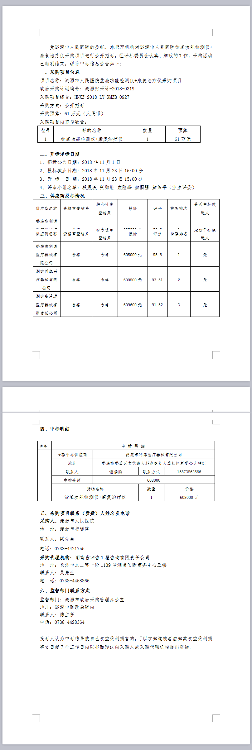 漣源市人民醫(yī)院盆底功能檢測儀+康復(fù)治療儀采購項目中標(biāo)結(jié)果公告