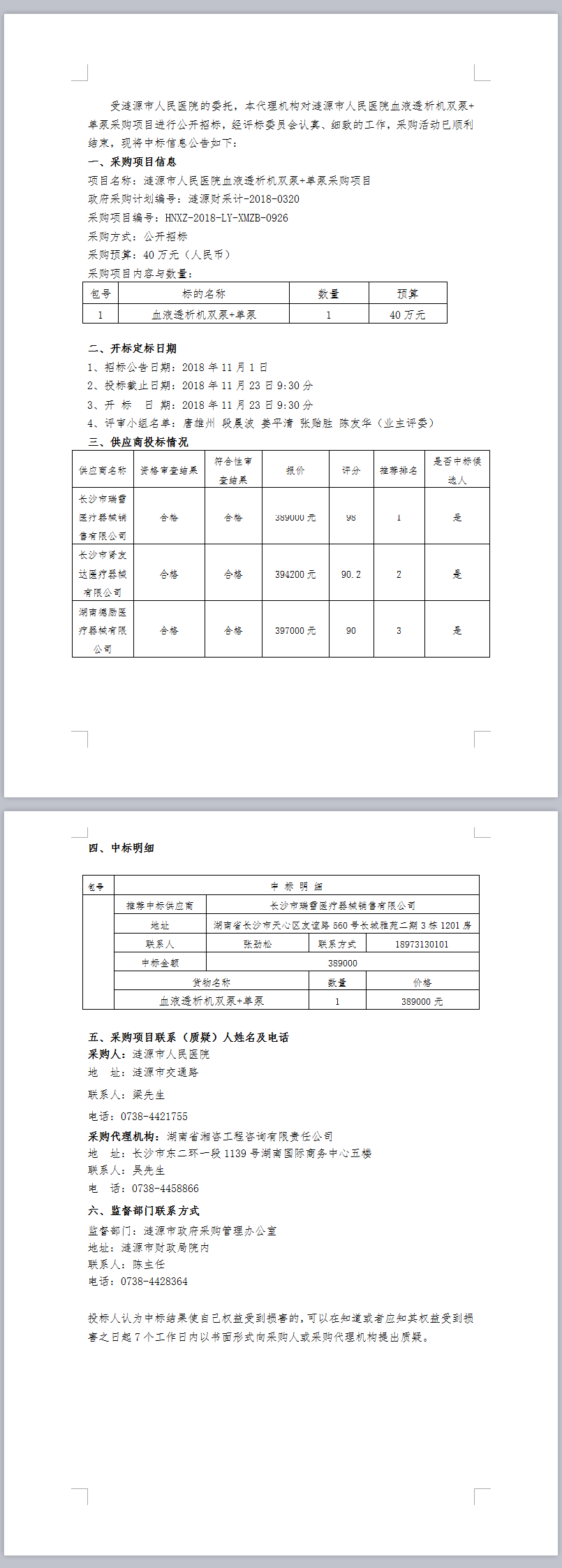 漣源市人民醫(yī)院血液透析機雙泵+單泵采購項目中標結果公告