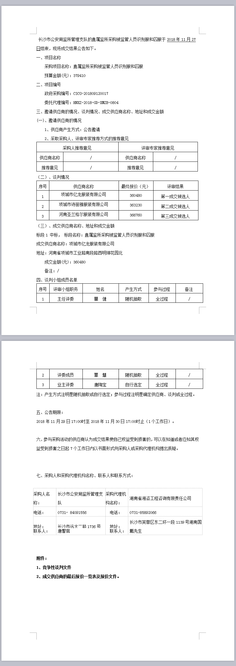 長沙市公安局監(jiān)所管理支隊直屬監(jiān)所采購被監(jiān)管人員識別服和囚服(第二次)結(jié)果公告