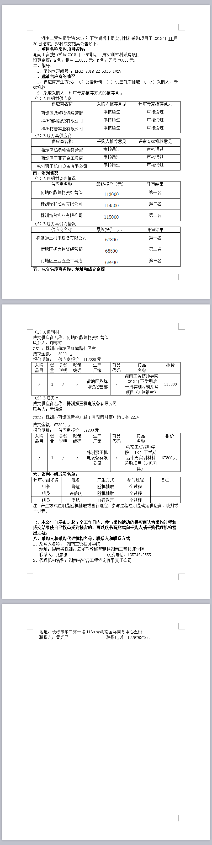 湖南工貿(mào)技師學(xué)院2018年下學(xué)期后十周實(shí)訓(xùn)材料采購項(xiàng)目競爭性談判成交公告