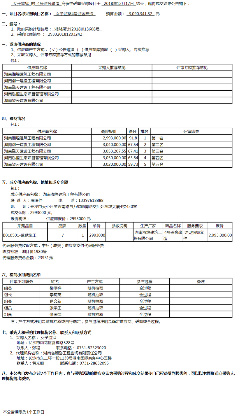湖南省女子監(jiān)獄4號監(jiān)舍改造工程項目成交結(jié)果公告