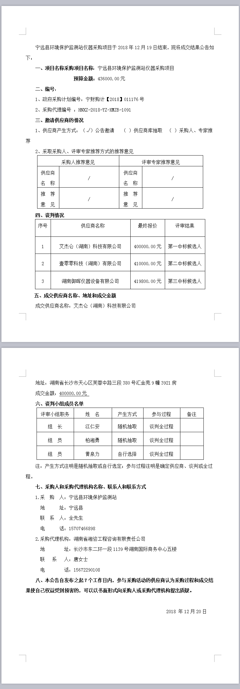 寧遠縣環(huán)境保護監(jiān)測站儀器采購項目 競爭性談判成交結(jié)果公告