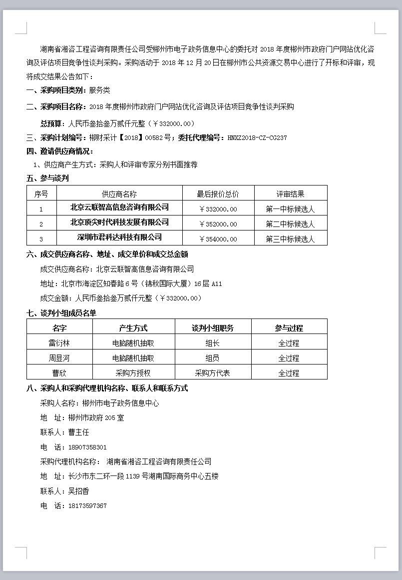 2018年度郴州市政府門戶網(wǎng)站優(yōu)化咨詢及評估項目競爭性談判采購(第二次)成交公告