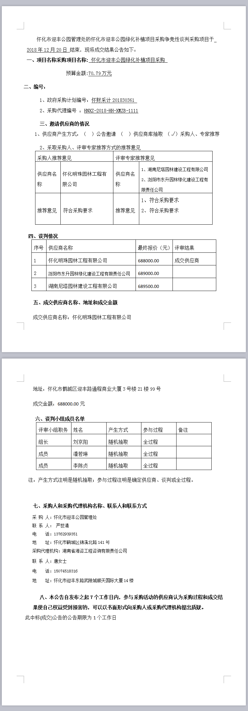 懷化市迎豐公園綠化補(bǔ)植項(xiàng)目采購(gòu)談判成交公告