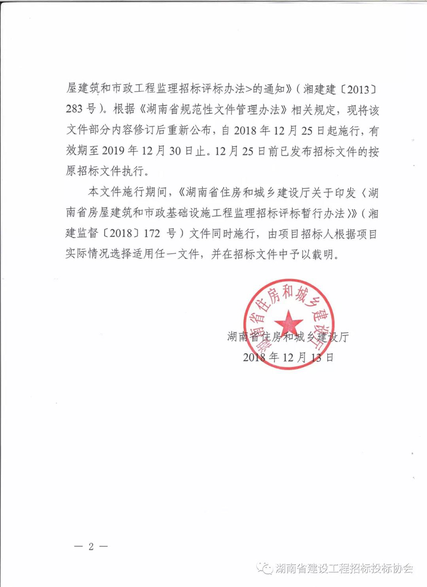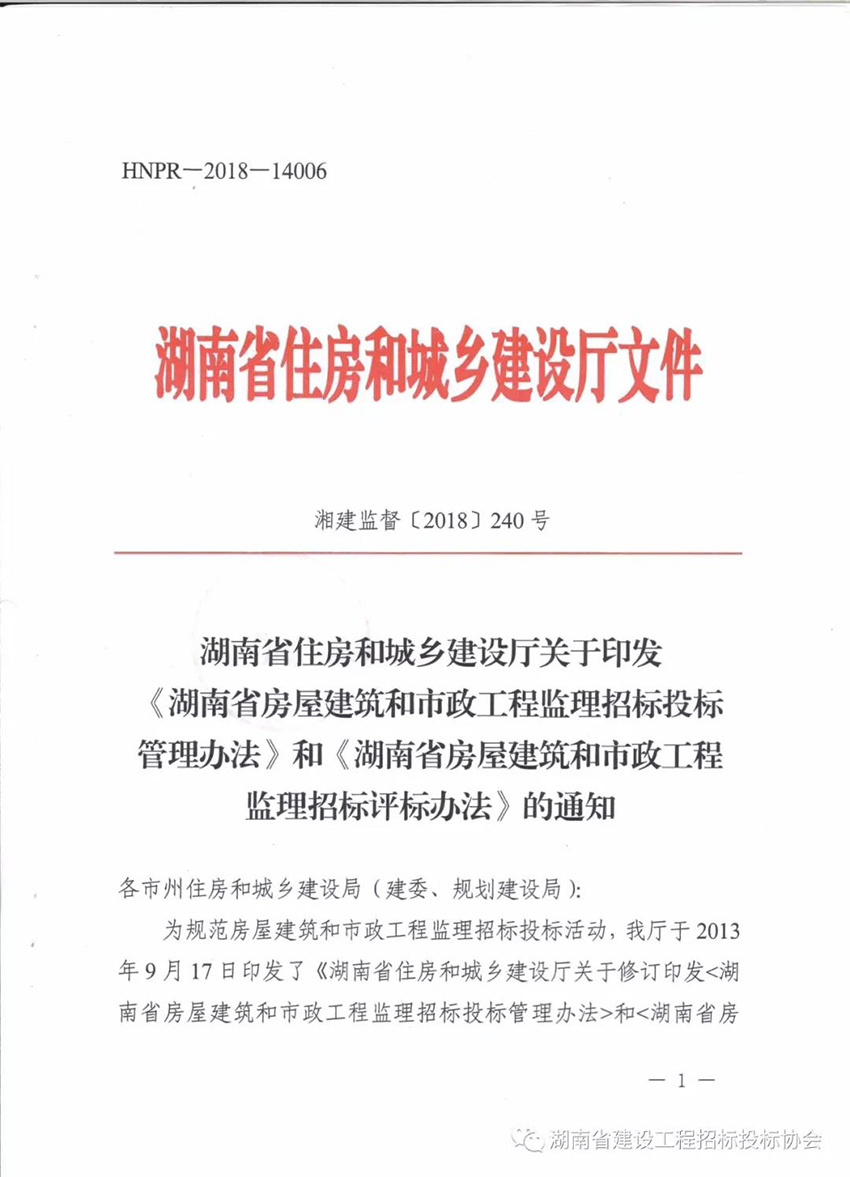 關(guān)于印發(fā)《湖南省房屋建筑和市政工程監(jiān)理招標投標管理辦法》和《湖南省房屋建筑和市政工程監(jiān)理招標評標辦法》的通知湘建監(jiān)督【2018】240號