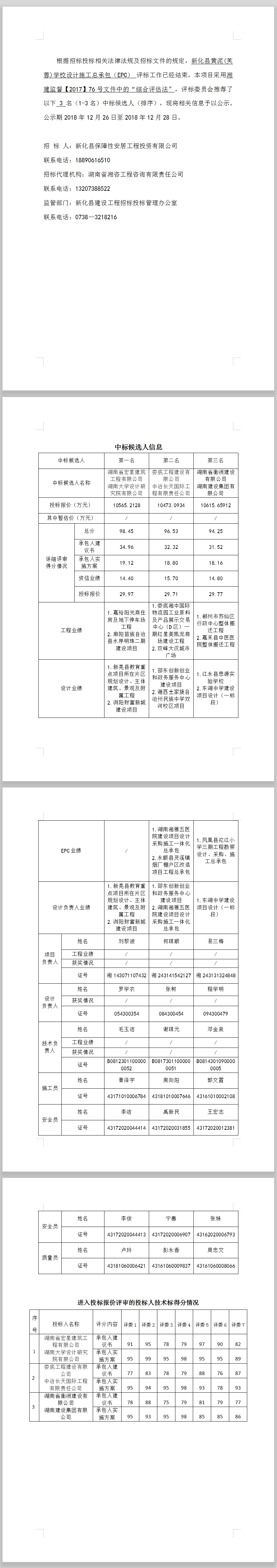 新化縣黃泥(芙蓉)學校設計施工總承包(EPC)中標候選人公示更正公告