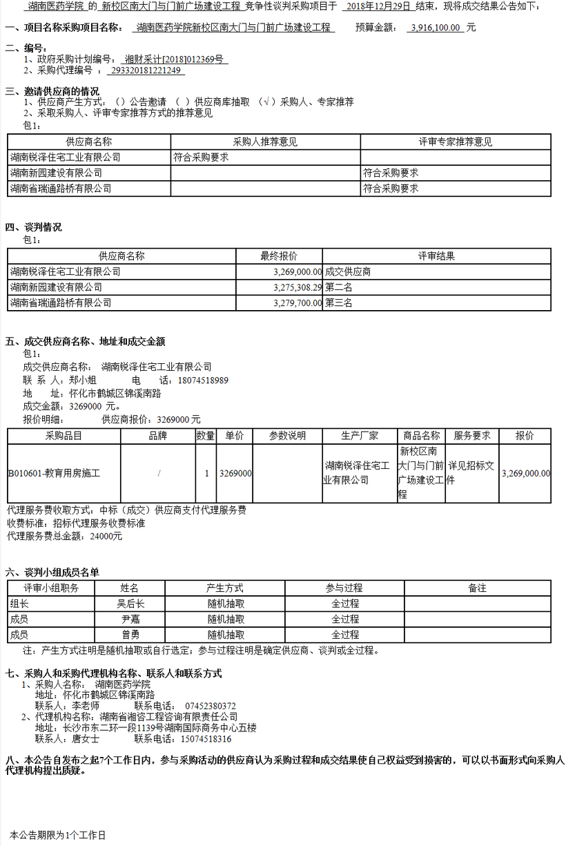 湖南醫(yī)藥學院新校區(qū)一期南大門與門前廣場工程談判成交公告