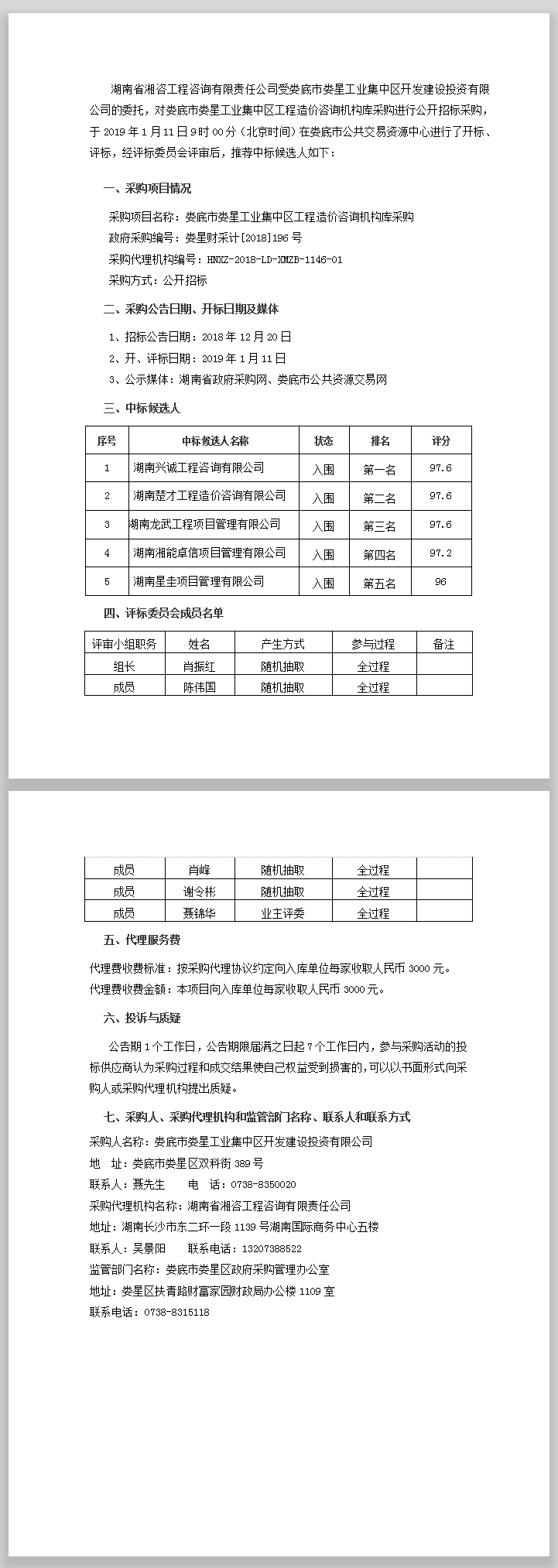 婁底市婁星工業(yè)集中區(qū)工程造價(jià)咨詢機(jī)構(gòu)庫采購(gòu)公開招標(biāo)中標(biāo)公告