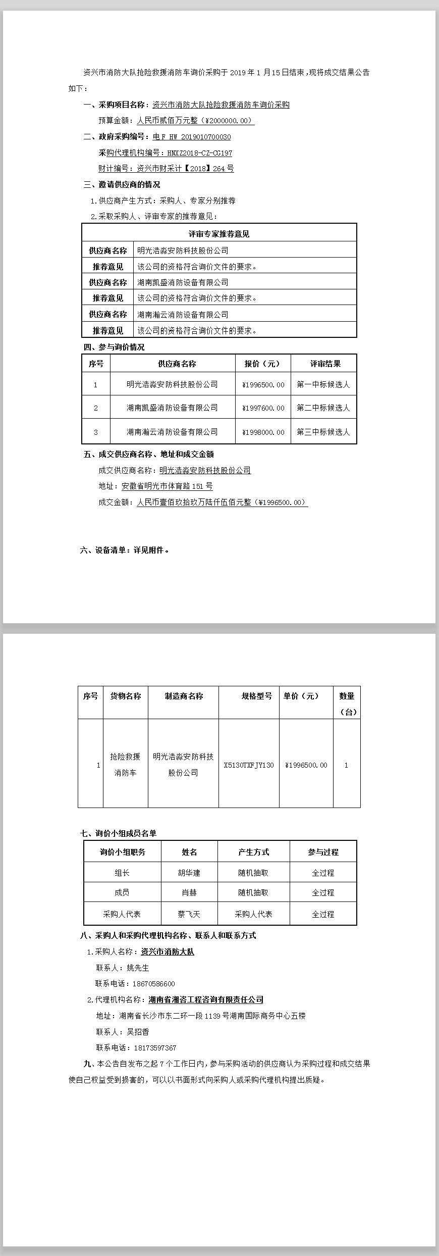 資興市消防大隊搶險救援消防車詢價采購成交結(jié)果公告