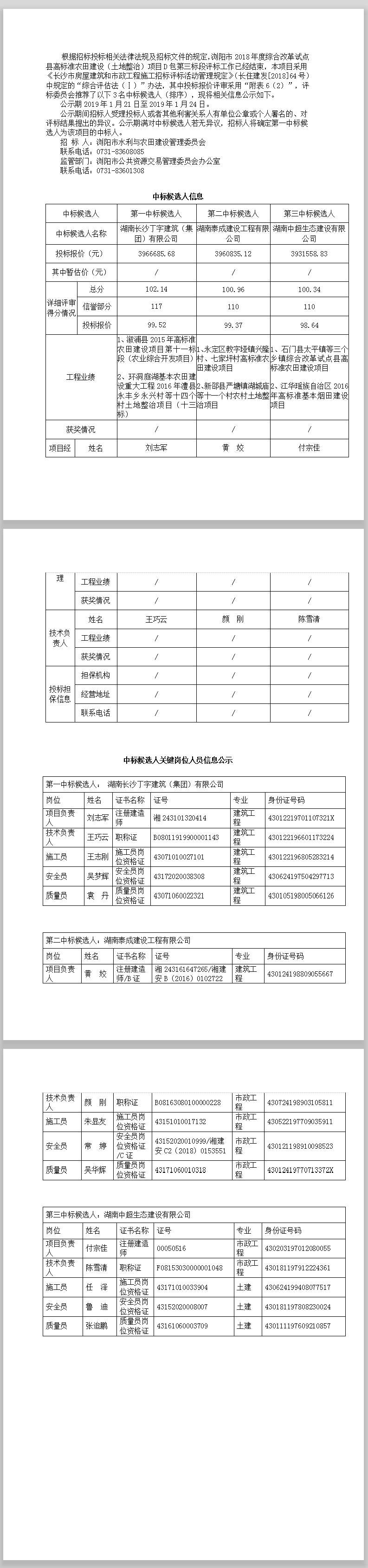 瀏陽市2018年度綜合改革試點縣高標準農(nóng)田建設(土地整治)項目D包第三標段中標候選人公示