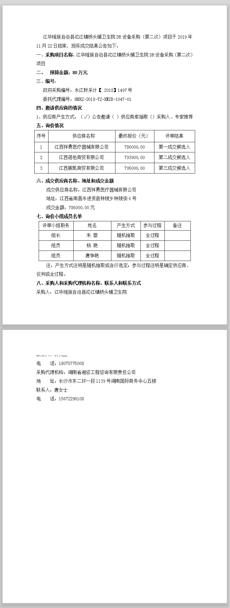 江華瑤族自治縣沱江鎮(zhèn)橋頭鋪衛(wèi)生院 DR設備采購(第二次)成交結果公告