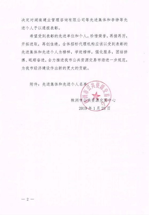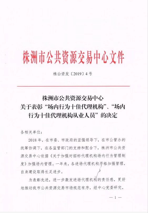 湖南省湘咨工程咨詢有限責(zé)任公司被評為株洲市公共資源交易中心“場內(nèi)行為十佳代理機構(gòu)”先進集體。