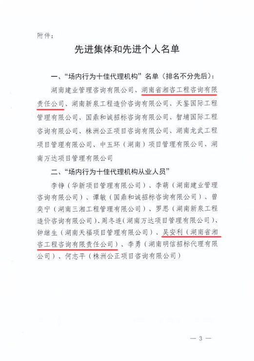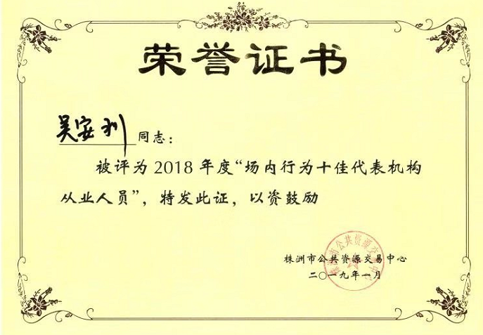 湖南省湘咨工程咨詢有限責(zé)任公司吳安利被評為株洲市公共資源交易中心“場內(nèi)行為十佳代理機構(gòu)從業(yè)人員”先進個人。