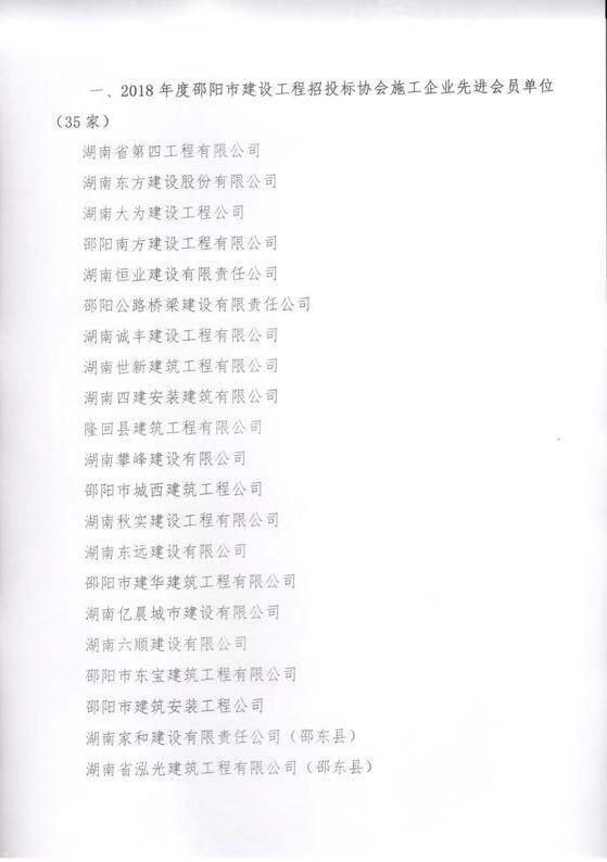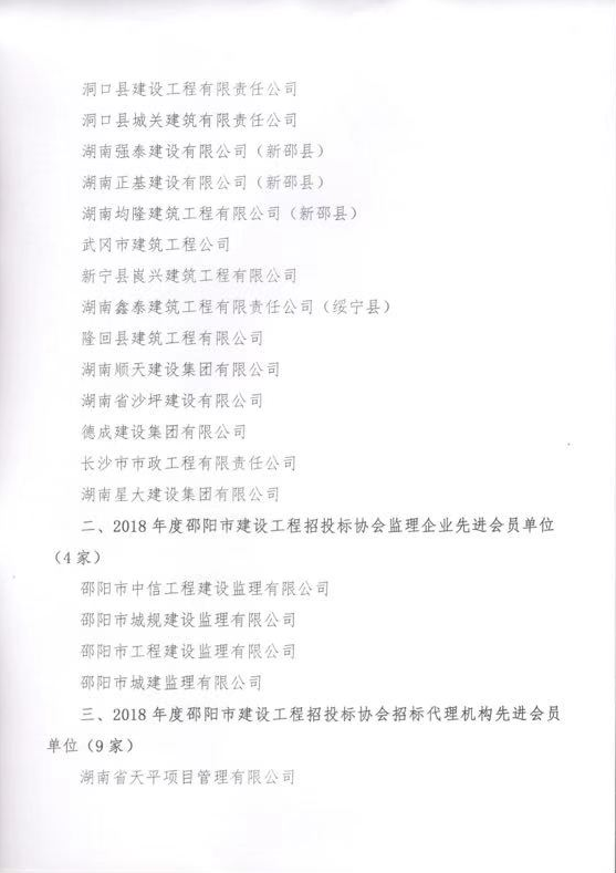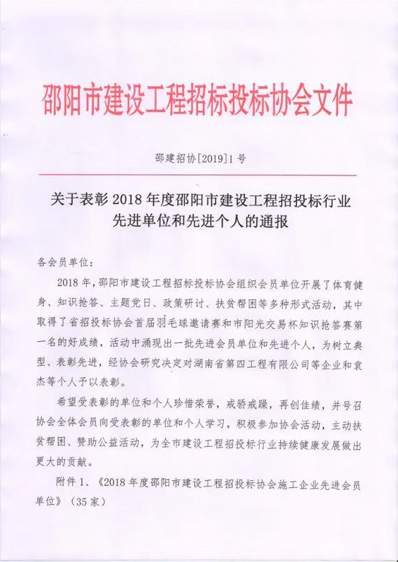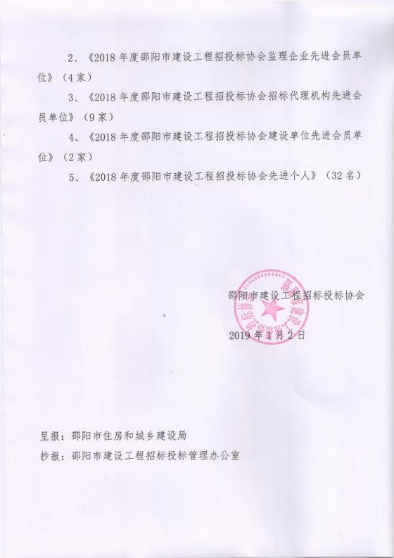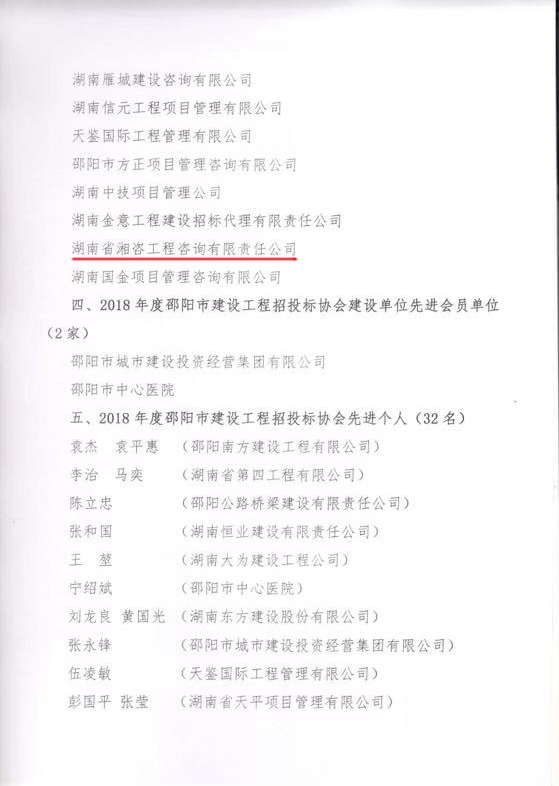 湖南省湘咨工程咨詢有限責(zé)任公司被邵陽市建設(shè)工程招標(biāo)投標(biāo)協(xié)會評為“2018年度邵陽市建設(shè)工程招投標(biāo)行業(yè)”先進單位。